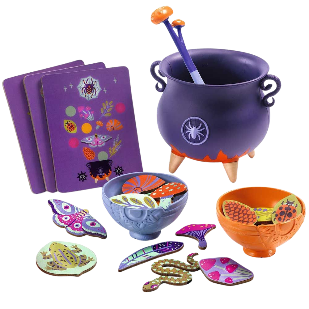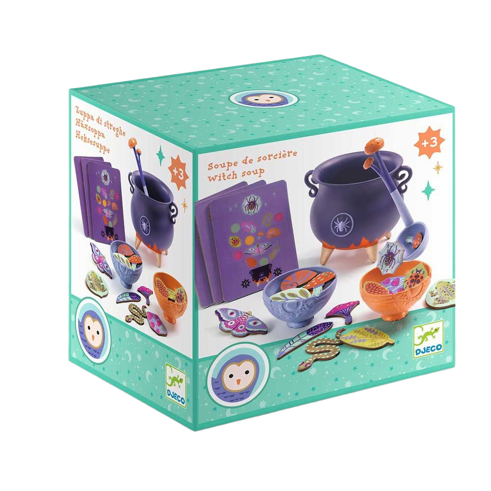 Witch Soup di Djeco è un gioco pieno di ironia e fantasia, che invita i bambini a vestire i panni di piccoli apprendisti stregoni. All’interno della confezione si trova un calderone decorato con gambe in legno, due scodelle, un mestolo, una pinza, vari ingredienti in legno e feltro e tre cartoncini‑ricetta. I bambini possono combinare ingredienti realizzando zuppe stravaganti seguendo le ricette oppure lasciando libera la propria immaginazione. Il set è realizzato in legno certificato FSC®, con finiture di qualità, misura circa 22 × 18 × 13 cm e include elementi in feltro e legno per un’esperienza tattilmente piacevole e creativa.