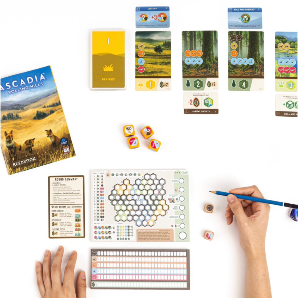 Immergiti nella natura con Cascadia: Rolling Hills! Questa nuova avventura nella serie di giochi flip & roll & write ti sfida a creare ecosistemi armoniosi ispirati agli habitat e alla fauna selvatica del Pacifico nord-occidentale.
