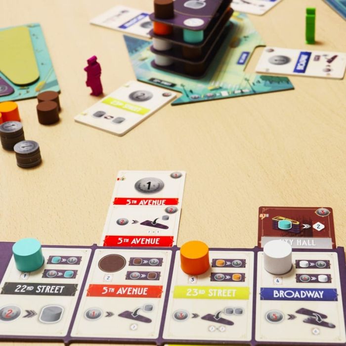 Flatiron è un gioco da tavolo che ti immerge nella storica atmosfera di Manhattan, New York, mentre partecipi alla costruzione di uno degli edifici più iconici della città, il Flatiron Building. Questo palazzo, originariamente noto come Fuller Building, è celebre per la sua forma triangolare che ricorda un vecchio ferro da stiro e si erge maestoso dal 1902.