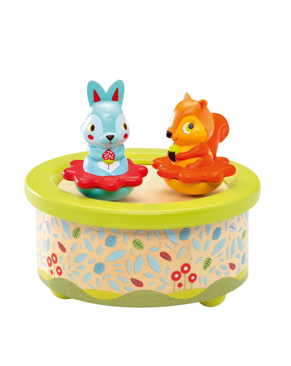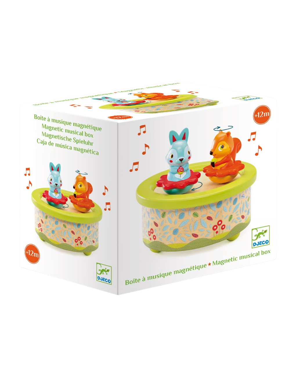 Friends Melody di Djeco è un delicato carillon magnetico pensato per bambini dai 12 mesi in su, perfetto per accompagnare momenti di dolcezza e rilassamento. Si tratta di una scatola tondeggiante decorata con scenari di animali in stile primaverile e corredato da due figurine magnetiche – un coniglietto e uno scoiattolo – che ruotano e danzano armoniosamente sulla superficie, una volta caricato il meccanismo a manovella La melodia suonata è la celebre “Ninna Nanna" di Franz Schubert, della durata di circa 2 minuti e 30 secondi.