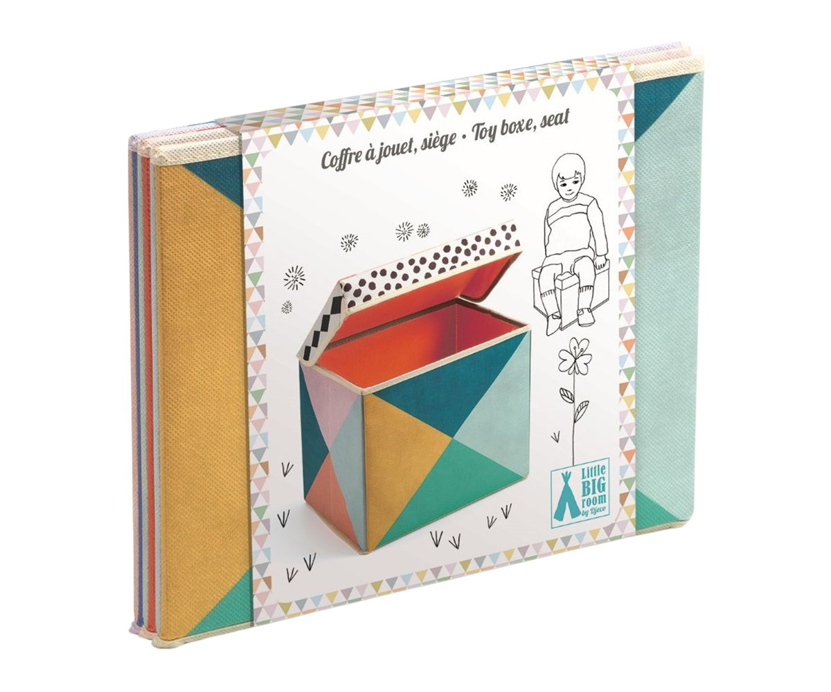 Geometry è una scatola portagiochi di Djeco dal design geometrico colorato, realizzata in legno e cartone, con rivestimento in tessuto non tessuto. Le sue dimensioni sono 29x25x25 cm, e può supportare un peso massimo di 30 kg, rendendola adatta anche come seduta per bambini. Viene fornita smontata, ma è facile da montare e può essere piegata per riporla quando non in uso. È un complemento d'arredo pratico e decorativo, ideale per tenere in ordine giocattoli, libri o altri oggetti nella cameretta dei bambini.