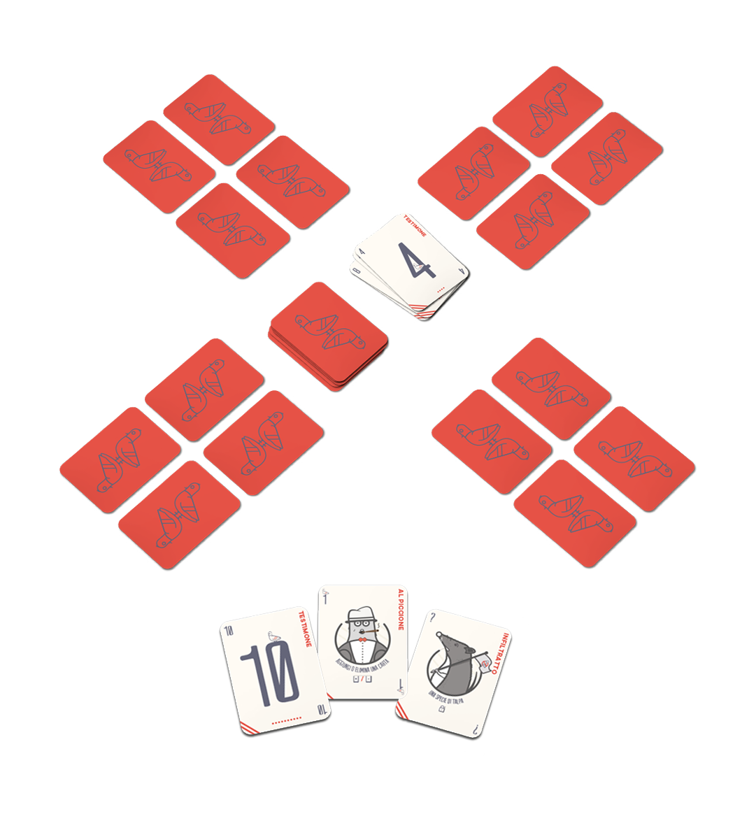Ciascun giocatore ha di fronte a sé la sua scena del crimine, composta da quattro carte coperte, che possono essere numerate (i testimoni) o speciali (di ogni tipo). Il tuo obiettivo è riuscire ad avere la scena del crimine dal valore più basso di tutti alla fine della partita.