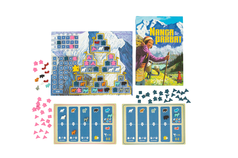 Nanga Parbat è progettato per due giocatori che si alternano nel posizionare i propri escursionisti sulla regione del tabellone dove si trova la guida. Dopo ogni posizionamento, la guida si sposta, costringendo l'avversario a scegliere una nuova regione per il proprio escursionista. Questo meccanismo di gioco crea una dinamica di movimento strategico e pianificazione. I giocatori possono anche catturare animali e utilizzare queste risorse per eseguire azioni speciali, aggiungendo un ulteriore livello di profondità tattica. La partita si conclude dopo 15 turni, e il vincitore è colui che avrà accumulato più punti.