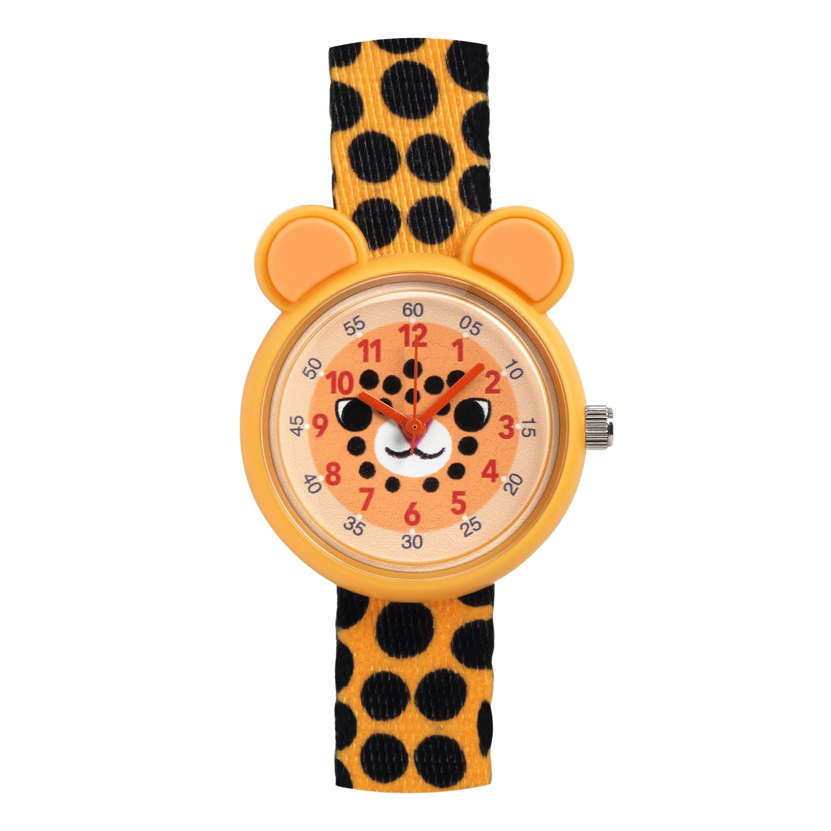 Un orologio da polso vivace e educativo per bambini dai 3 anni in su, con un cinturino arancione ispirato al ghepardo, decorato con macchie e simpatiche orecchie in rilievo.