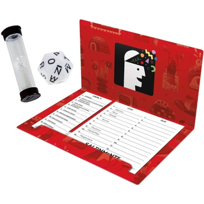 In Saltinmente occorre tirare il dado con le lettere a 20 facce, capovolgere la clessidra e pensare a risposte originali per ogni categoria sulla lista.