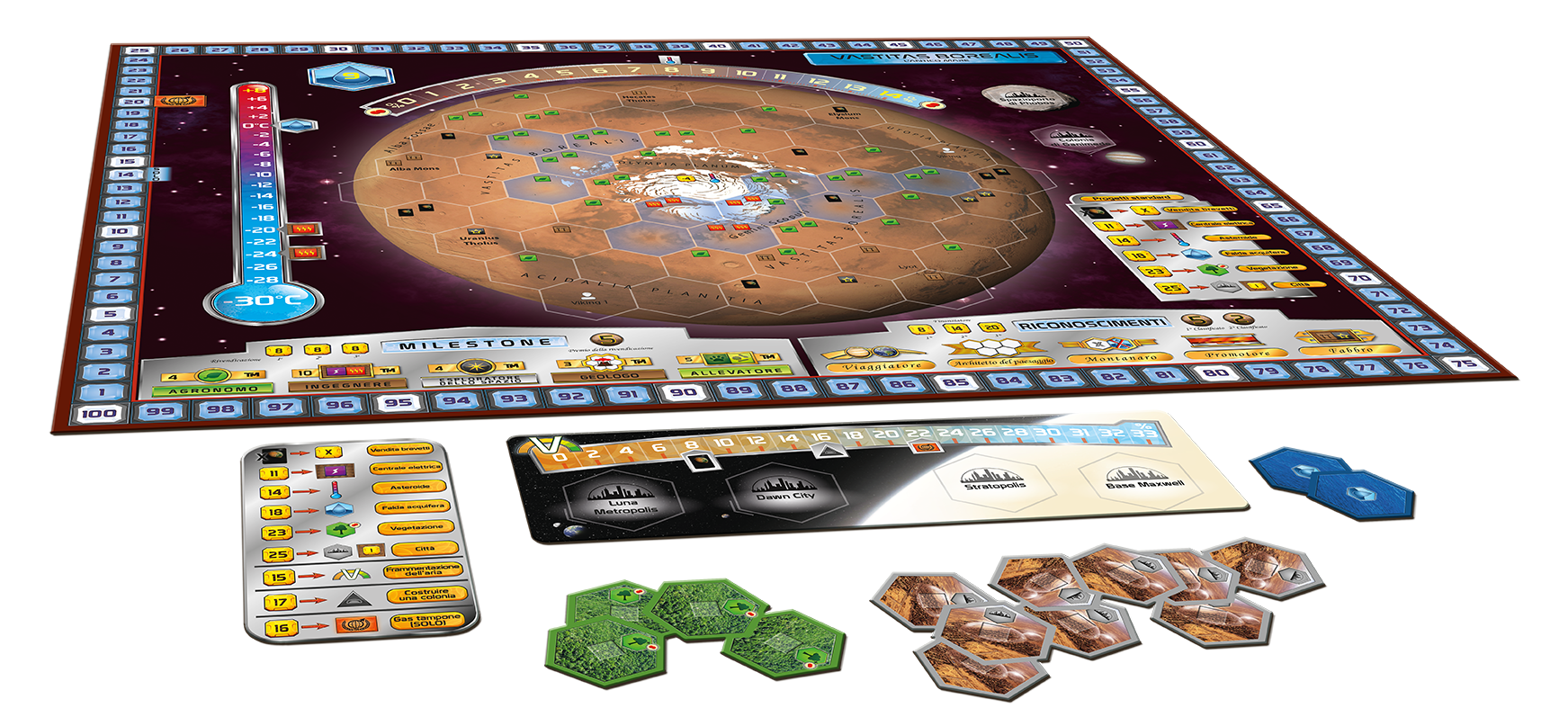 Errata: nel foglio riassuntivo il riconoscimento "Fabbricante" della mappa AMAZONIS PLANITIA riporta una descrizione errata. Il corretto criterio per il riconoscimento è la più alta produzione di Acciaio e Calore, sommati.
