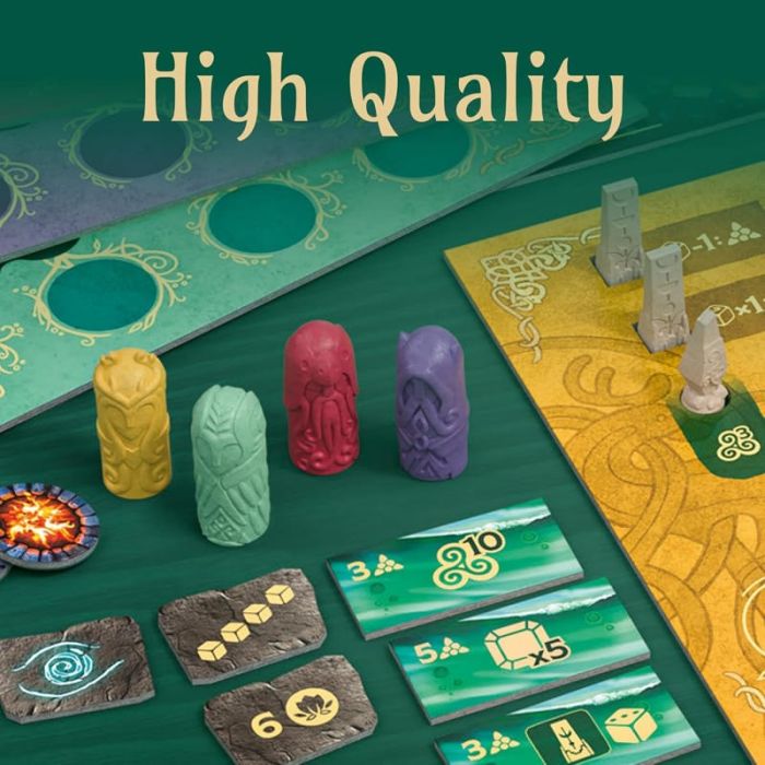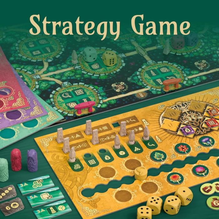 In The Druids of Edora, i giocatori devono gestire strategicamente il piazzamento dei dadi per costruire strutture sacre e raccogliere risorse essenziali. Ogni turno offre la possibilità di esplorare nuovi siti, raccogliere materiali preziosi e utilizzare abilità speciali per avanzare nel gioco. Le meccaniche coinvolgono la costruzione di menhir e stele, l'uso di erbe curative per ottenere vantaggi e l'utilizzo di pietre misteriose per sbloccare nuove capacità. L'obiettivo è accumulare prestigio attraverso strategie diversificate e superare gli avversari in astuzia e abilità.