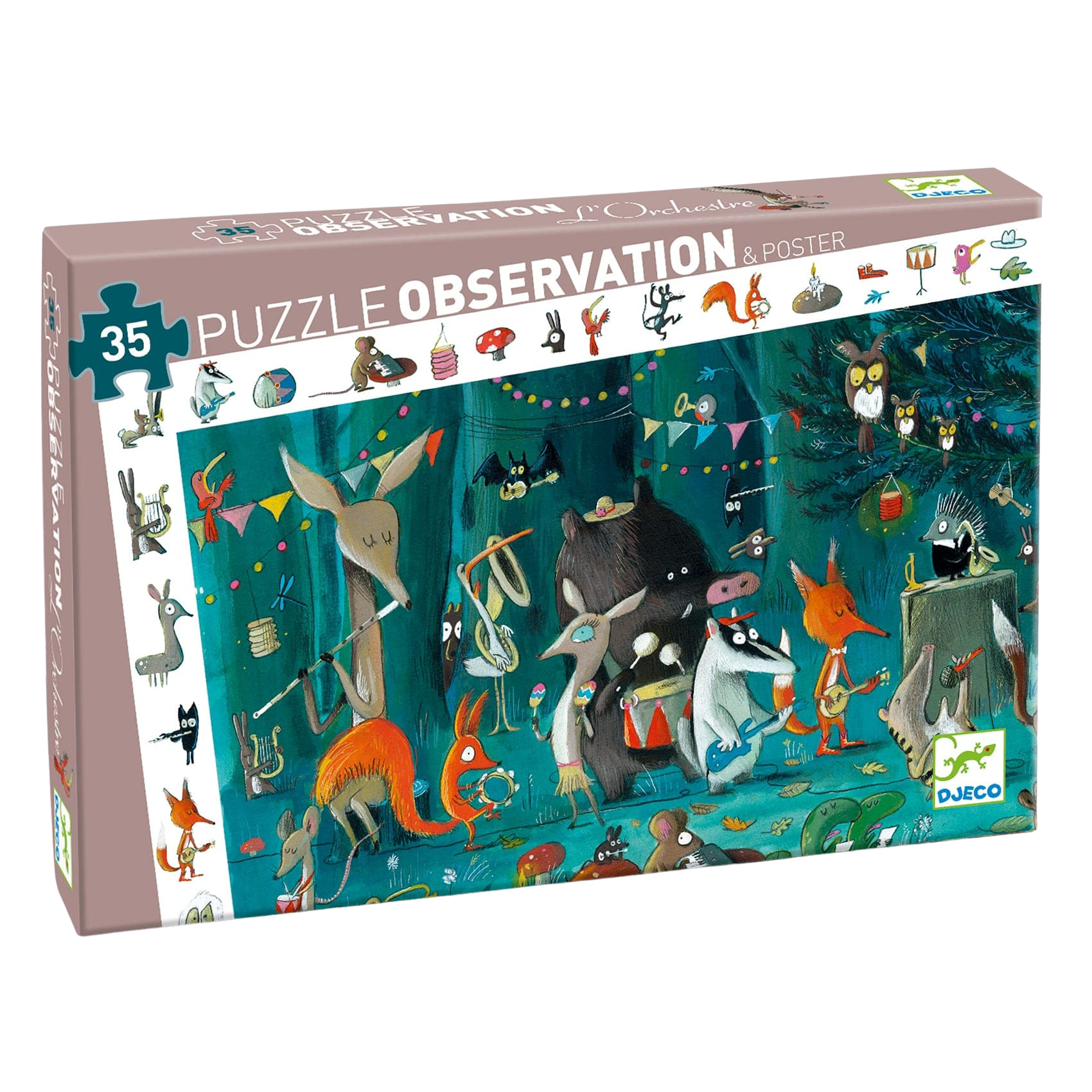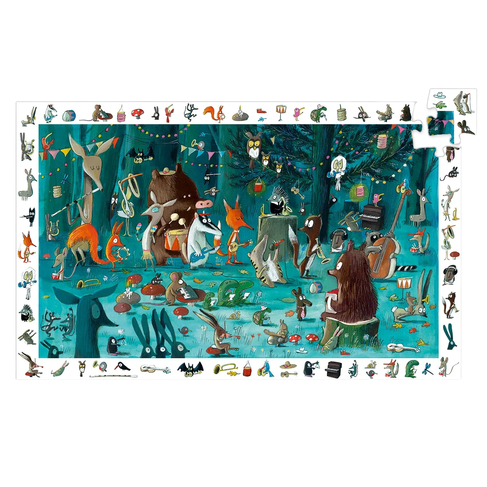 I piccoli musicisti animali – come il coniglio al violino e il riccio all’accordeon – suonano insieme in un’atmosfera incantata. Dopo aver completato il puzzle, il gioco continua: i bambini possono cercare gli oggetti raffigurati nel bordo dell’immagine, stimolando l’attenzione ai dettagli e la concentrazione. Il puzzle include anche un poster a grandezza naturale per aiutare nella composizione e come elemento decorativo. Realizzato in cartone resistente e certificato FSC.
