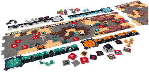 La scatola include 5 tessere stradali fronte-retro, 12 miniature di auto, 4 miniature di elicottero, 4 miniature di rottame, 12 cruscotti, 4 plance di comando, 16 dadi movimento, 5 dadi FX, segnalini danno e pericolo, una tessera traguardo e il regolamento. Ogni componente è progettato per offrire un'esperienza di gioco immersiva e coinvolgente.