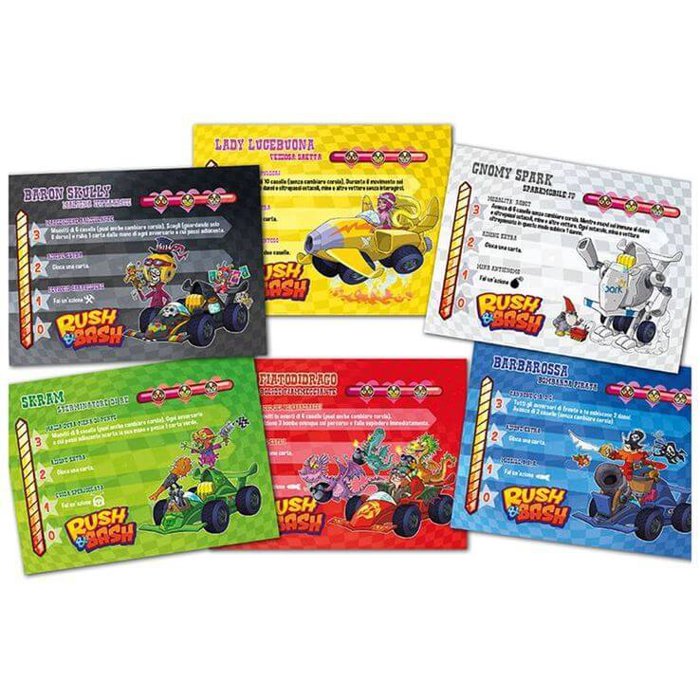Durante il tuo turno in Rush & Bash, giocherai una carta che conferisce alla tua vettura un effetto speciale, come lanciare missili, piazzare mine, riparare la vettura o caricare abilità speciali, insieme a un valore di movimento in linea retta. Inoltre, potrai utilizzare le tue devastanti abilità speciali uniche! La posizione in gara determina da quale delle due file di carte pescherai, mantenendo sempre aperta la possibilità di una rimonta sorprendente. Il gioco include anche una modalità campionato, che consente di giocare più gare in sequenza. La plancia modulare si costruisce combinando 12 tessere con vari elementi 3D, come ponti, vulcani e creature erranti.